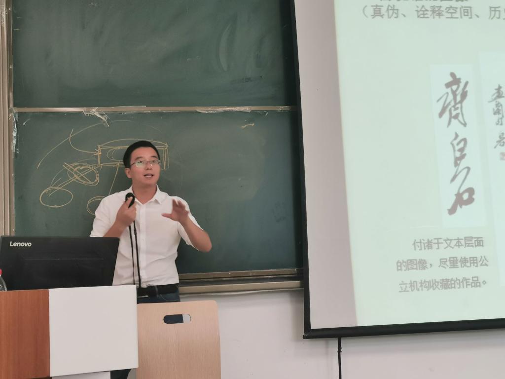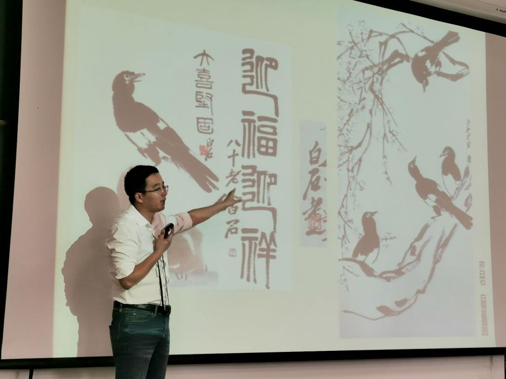 张老师向同学们讲解了写艺术类学术论文时应注意的各项标准,从艺术史写作的基础、过程、目的等方面进行了详细阐述。期间,张老师借助齐白石的画作、生平经历等,让同学们从中体会图像文献在艺术史写作中的重要作用,并将大量名人画作与齐白石的画作进行了比较,使同学们认识到了齐白石画作大多取材民间,并有吉祥如意、轻松愉快、幽默十足和十分贴近生活的特点。