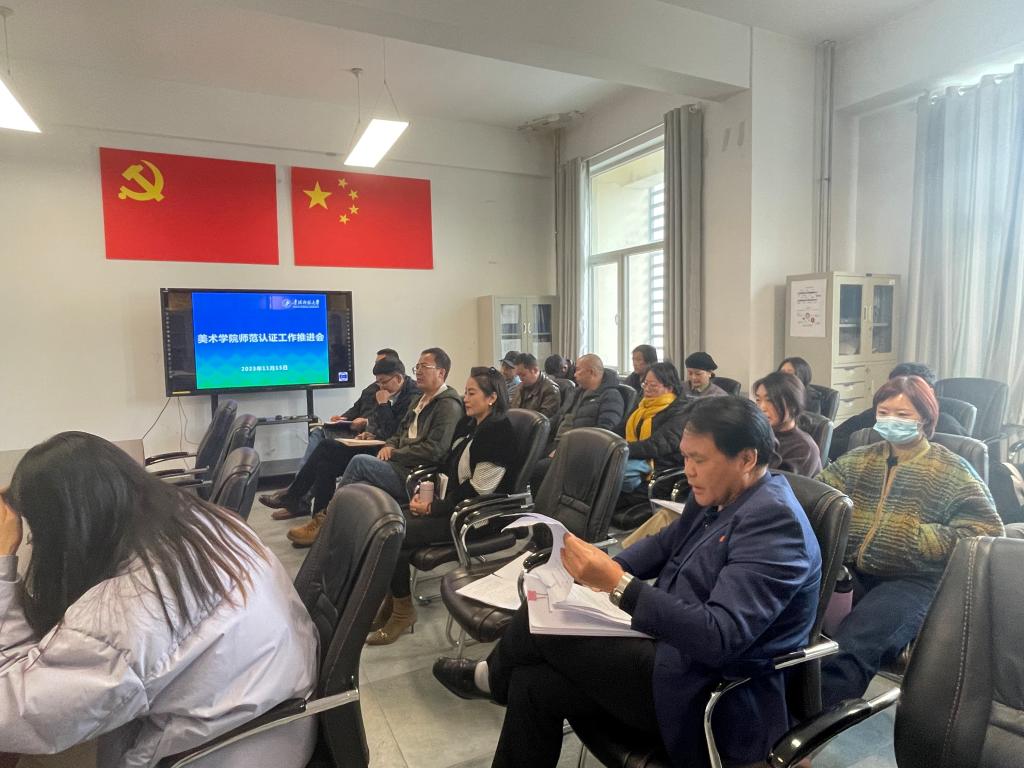 为迎接即将到来的师范认证专家审核,美术系系主任曹正海就美术学师范认证工作再次进行了周密的安排,对自评报告的修改、支撑材料的完善、教学档案的整理提出了详细的要求,明确了责任分工和时间节点,对老师们提出的相关教学材料准备方面的问题进行了一一解答。