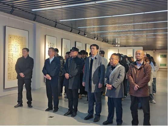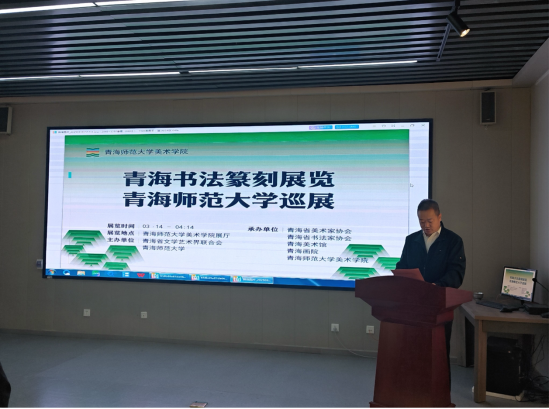 青海省书法家协会常务副主席郭强先生上台宣布展览开幕并发表了讲话,他高度评价了本次展览作品的艺术水准,并肯定了美术学经理期以来在青海艺术教育与创新方面的努力,鼓励师生继续深耕,创作更多佳作。